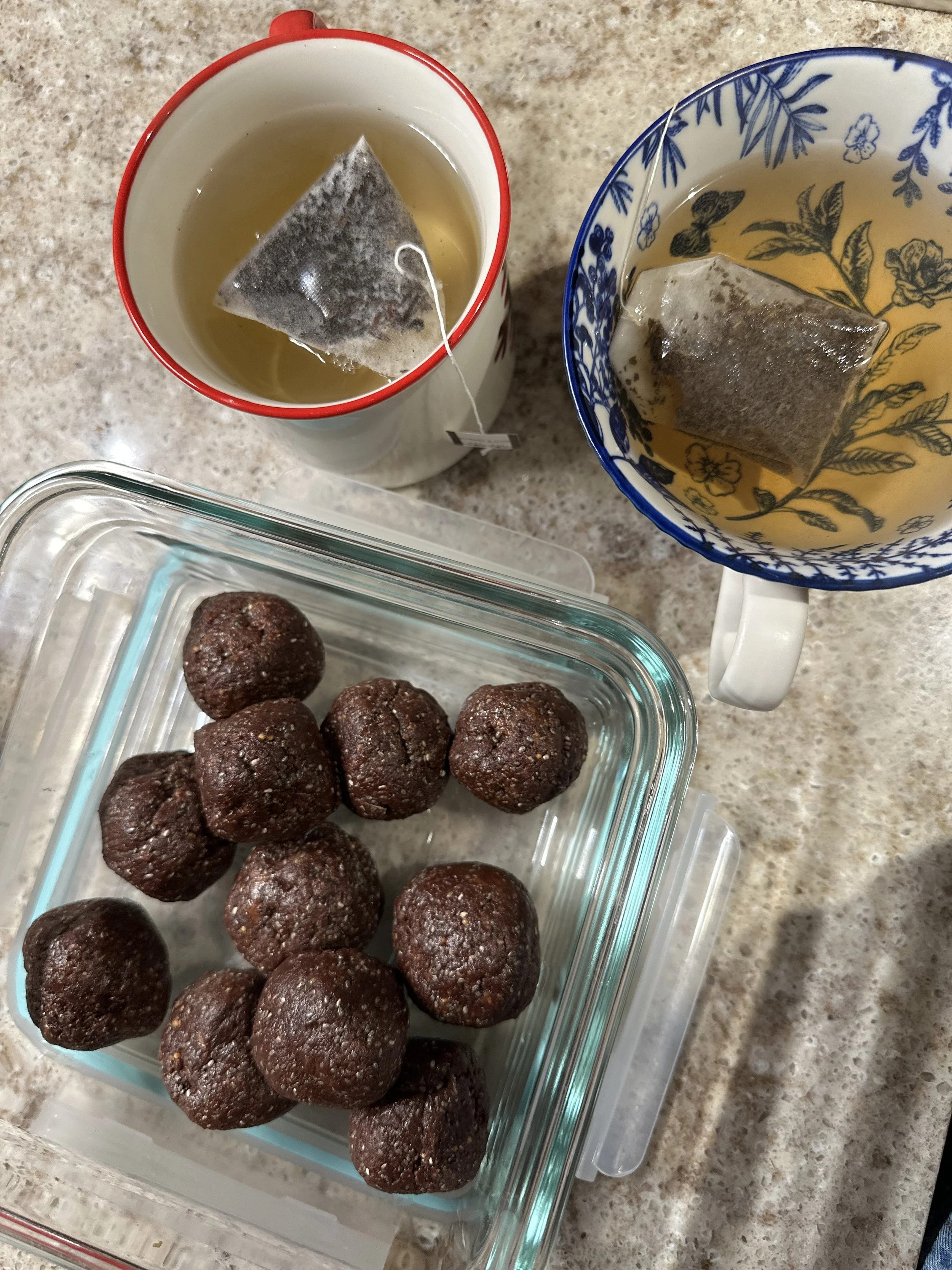 Combine 1/4 cup flax seed meal, 1/4 cup almond flour, 4 tablespoons chia, 1/3 cup peanut butter, 4 tablespoons cocoa powder, 1/4 cup maple syrup and 1/4 cup of milk. Roll into balls. It’s so quick and super nourishing for whole food snack. Top with flaky sea salt for bonus points.